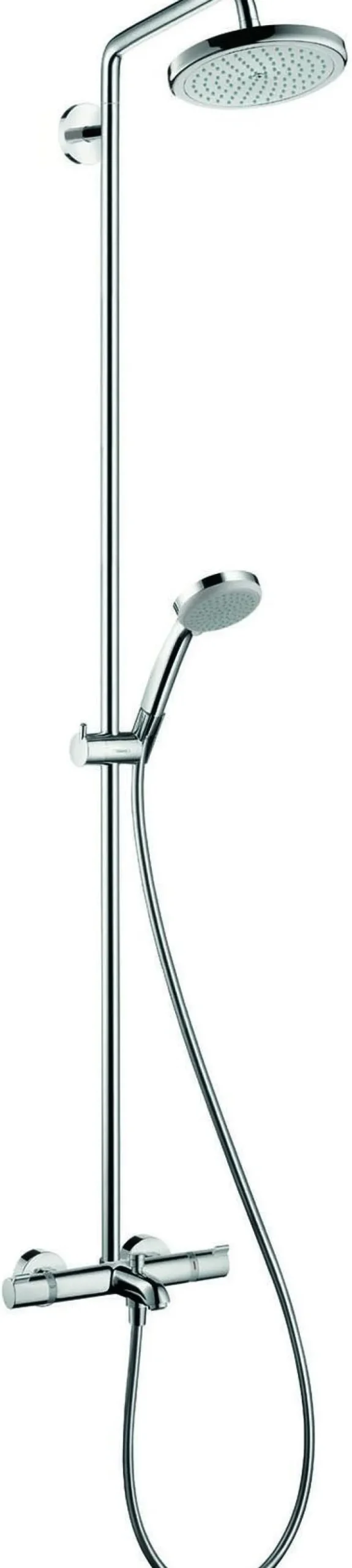 Hansgrohe Croma 220 sadesuihkusetti 150 cc, jossa yläsuihku, käsisuihku, amme- ja suihkuhana (kylpyammehana), suihkutanko, suihkuletku ja liukusäädin.