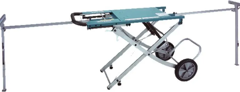 Sahapenkki katkaisu- ja jiirisahalle. Penkissä on suuret ja tukevat pyörät ja pitkät säädettävät materiaalituet sekä säädettävät tukijalat epätasaisille pinnoille. Saha voidaan jättää kiinni kuljetuksen ajaksi.
