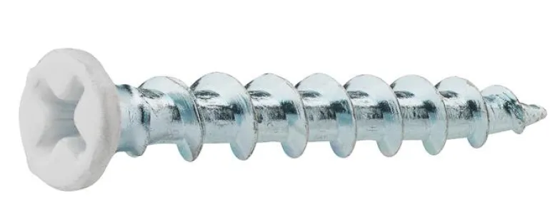 CE-hyväksytty sähköasennusruuvi jolla kaulus. Sinkitty ja maalattu valkoiseksi. Pintakarkaistua terästä.