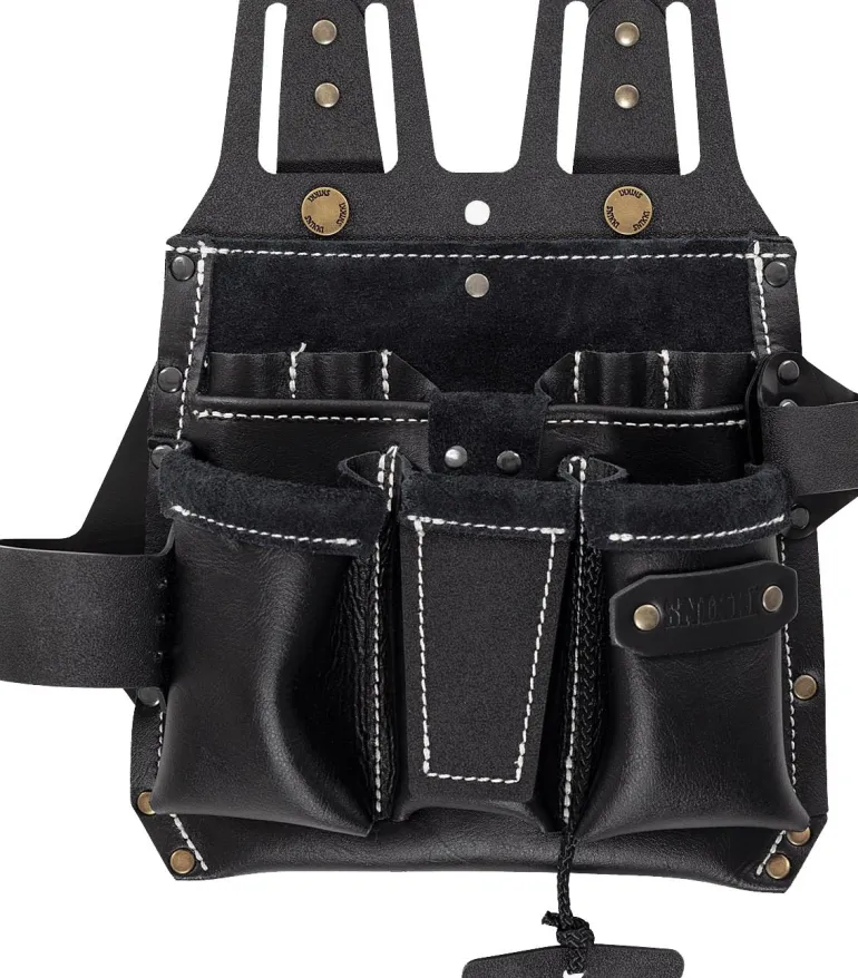 Sähköasentajan työkalutasku asentajille jne. Tuotteessa on 7 taskua ruuvitaltoille, pihdeille, leikkureille, johdonkuorijoille ym., sekä kolme taskua eristetyille pihdeille.