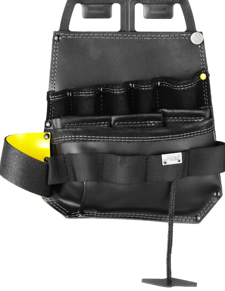 Sähköasentajan nahkatasku tärkeimmille työkaluillesi. Ainutlaatuisesti suunniteltu Snickers Workwear -työkaluvöille. Kestävä vahvasta nahasta valmistettu tasku, jonka kaksinkertaiset saumat ja niitit lisäävät kestävyyttä. Vahvistetut lokerot ja kestävät nailonsilmukat antavat hyvän yleisnäkymän ja mahdollistavat ruuvitaltan, pihtien, puukon ja jännitemittarin helpon käytön. Vasaran pidike kestävää kumia vinyylipinnoitteella, sopii Hultaforsin sähkövasaroille, kynäteline ja puukkopidike, joka sopii Hultaforsin rakentajan puukoille. Ainutlaatuinen ratkaisu helppoon ja luotettavaan kiinnittämiseen työkaluvyöhön.