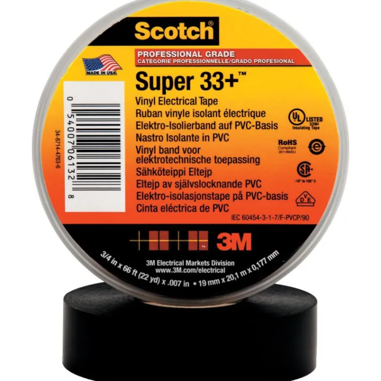 Scotch Super 33+ on 19 mm x 20 m sähköteippi, joka soveltuu ensisijaiseen sähköeristykseen kaikissa johdin- ja kaapeliliitoksissa, joiden nimellisjännite on 600 V ja 105 ° C. Elastinen teippi koostuu elastisesta tukimateriaalista, jolla on aggressiivinen liima – kosteudenkestävää sähköistä ja mekaanista suojausta varten, jolla on pienin mahdollinen paksuus.