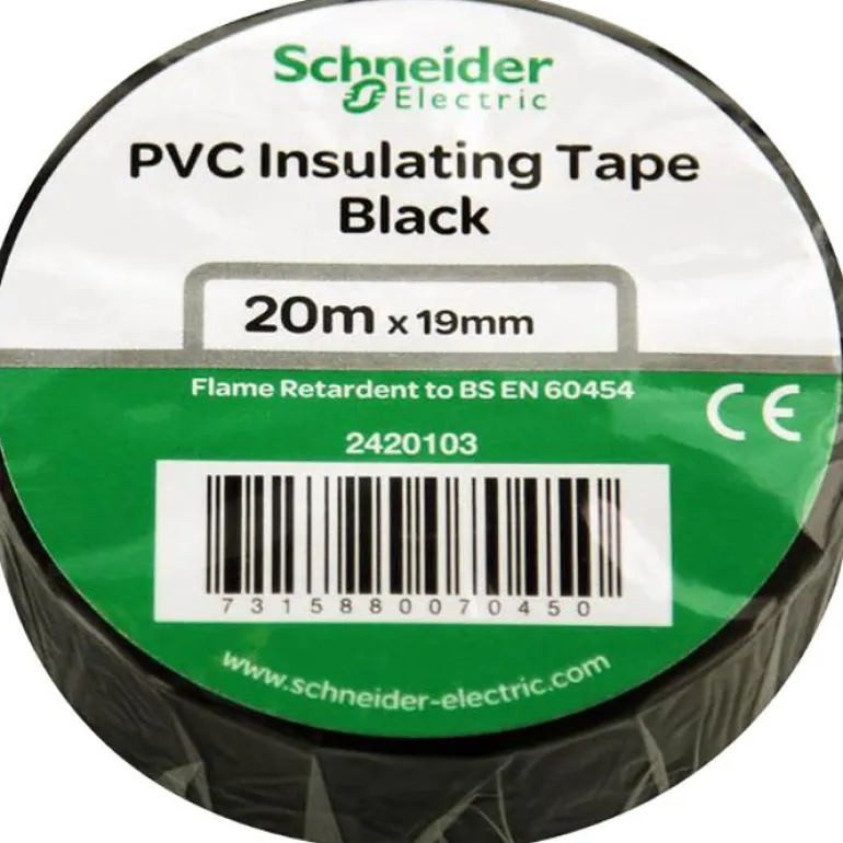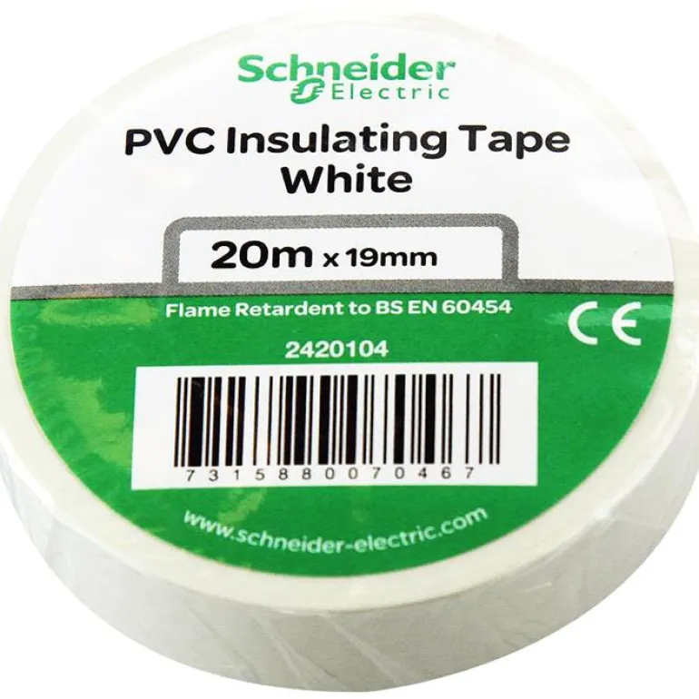 Schneider 2420104 on pehmeästä ja joustavasta PVC: stä valmistettu valkoinen sähköteippi. Teipillä on erittäin hyvä tarttuvuus, ja se soveltuu sähköasennuksiin ja esimerkiksi kaapeleiden ja putkien liitoksiin.