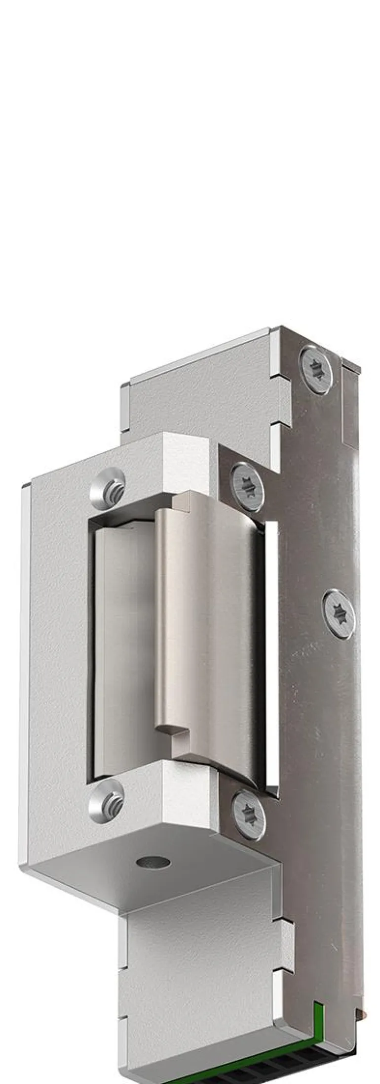 Palohyväksytty salpalukitsemiseen tarkoitetulla kiinteällä aukolla varustettu sähkötoiminen päätylevy. Palohyväksytyssä STEP 98 Preload -päätylevyssä on kiinteä syvennys, jossa oven lukitussalpa tai suora salpa voi lukkiutua, mikä estää oven pääsyjärjestelmän/koodilukon käytön tai oviautomaation.