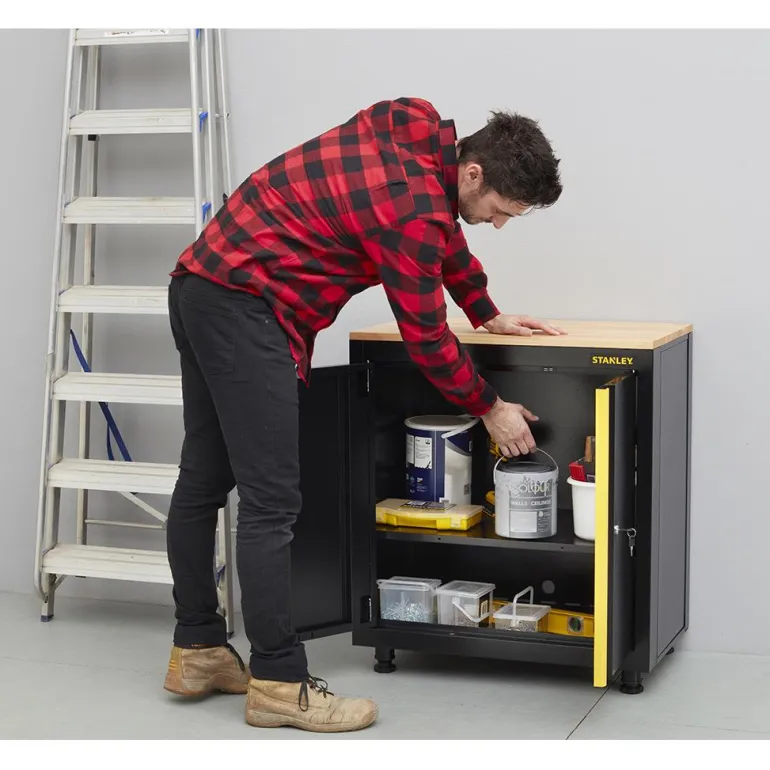 STANLEY® Ready- To- Assemble on helposti asennettava säilytysratkaisusarja autotalleihin ja työtiloihin. Ihanteellinen työkalujen ja työtarvikkeiden järjestämiseen ja säilytykseen turvallisesti ja organisoidusti. Moduulisäilytysratkaisu on suunniteltu varmistamaan, että asennustöihin ei hukkaannu aikaa. Toimitetaan litteässä paketissa, vaatii äärimmäisen vähän asennustöitä ja aikaa. 2-ovinen kaappi, jossa täysleveä hyllytaso jopa 68 kg kuormankestolla. Täydellinen erilaisten työkalujen ja varusteiden säilytykseen. Kaapin yläosassa on 20 mm paksu puulevy, josta saa työtason yleistöihin. Vankka teräsrunko tuo lisävahvuutta ja kestävyyttä. Sisäänrakennettu lukkojärjestelmä magneettikoukuilla varmistavat ovien lukituksen ja sulkemisen. Kaappi on helppo säätää epätasaiselle pinnalle 4 jalan avulla. Kaappi on taitettava, eli suuret osat taittuvat yhdellä liikkeellä auki ja asentaminen vaatii vain muutamia minuutteja pakkaukseen kuuluvalla asennustyökalulla. Kaapin purku ja uudelleenasennus on helppoa esimerkiksi muuton yhteydessä. Kuormansieto jopa 250 kg. Mitat: 87 cm K x 77,5 cm L x 46 cm S. Paino: 24,5 kg Kaappi toimitetaan litteässä pakkauksessa.