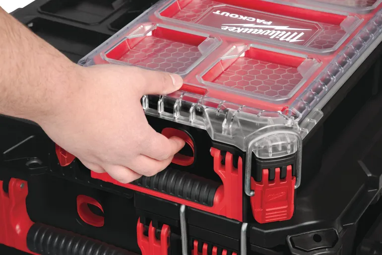 Milwaukee Packout-säilytyslaukku 250x380x120 mm. Sisällä on 5 viisi irrotettavaa ja kiinnitettävää lokeroa, joita voidaan käyttää tavallisimmilla työpaikan tarvikkeilla.
