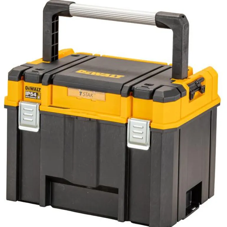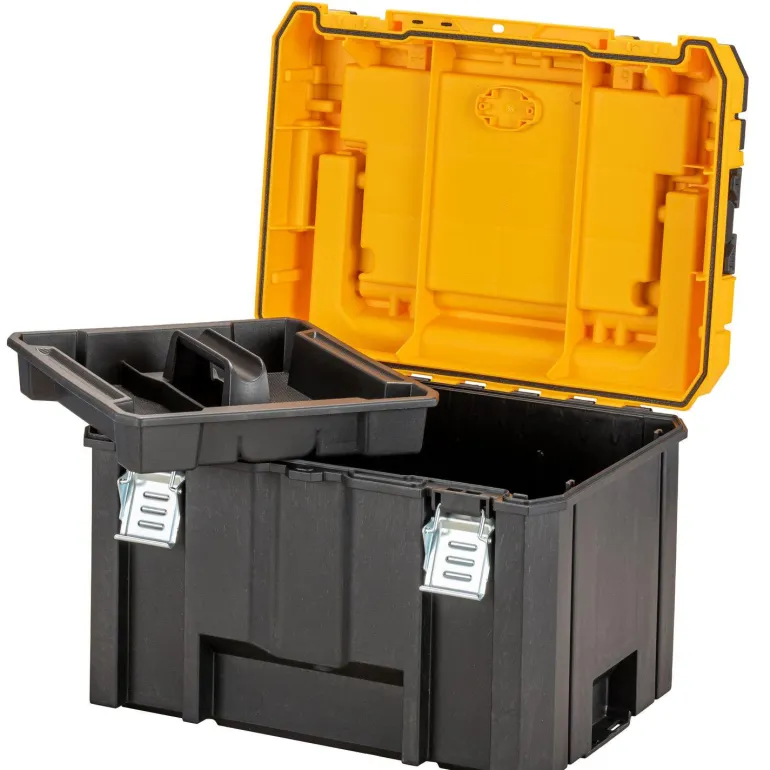 Avoin säilytyslaatikko – nopea ja helppo pääsy työkaluihin ja lisävarusteisiin. Pitkä alumiinikahva takaa parhaan kestävyyden. Yläsäilytyslaatikko (ei IP-luokiteltu) lisävarusteiden ja komponenttien helpolle säilytykselle. DEWALT TRACKER – kiinnityspiste sisäänrakennettu TSTAK-laatikoihin, jotta DEWALT Tracker voidaan asentaa ja seurata DEWALT Tool Connectin avulla. Lukittava riippulukko lisää turvallisuutta. Kestävät metalliset soljet vakautta ja kestävyyttä varten. Metallisivusoljet mahdollistavat TSTAK-moduulien liittämisen yhteen.