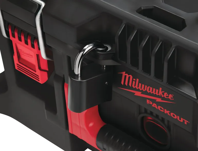 Milwaukee Packout -säilytyslaatikko 560x410x290 mm. IP65-luokitus pitää sateen ja rakennuspölyn poissa. Metallivahvisteet takaavat pidemmän käyttöiän.