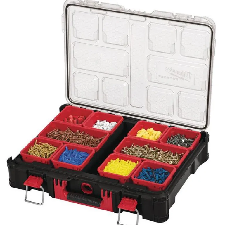 Milwaukee Packout-säilytyslaukku 500x380x120 mm. Sisällä on 10 irrotettavaa ja kiinnitettävää lokeroa.