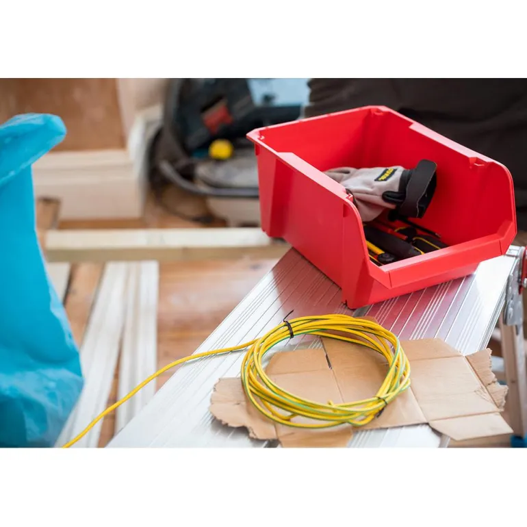 Suuri punainen säilytyslaatikko, jossa on suuri käyttöä helpottava aukko. Järjestä pikkutavarat ja tarvikkeet monipuolisella STANLEY®-säilytyslaatikolla. Laatikot voi pinota erilaisia säilytysratkaisuja varten.