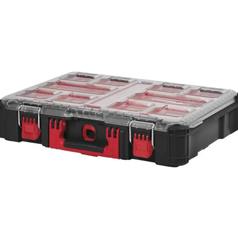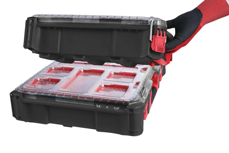 Milwaukee Packout-säilytyslaukku 500x380x120 mm. Sisällä on 10 irrotettavaa ja kiinnitettävää lokeroa.