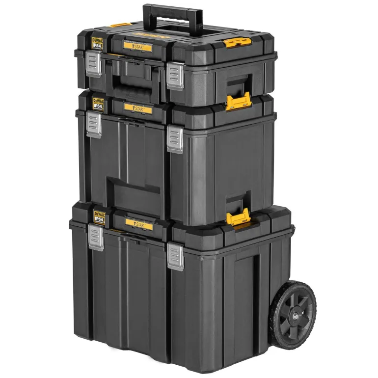 Säilytysvaunu, kapasiteetti 50 kg, liikuteltavat laatikot, yksi syvä ja yksi matala laatikko. Vaunussa on 7-tuumaiset pyörät ja teleskooppinen kahva, mikä mahdollistaa raskaiden työkalujen helpon kuljetuksen. IP54-luokitus, mikä tarkoittaa, että työkalut on suojattu vedeltä ja pölyltä.