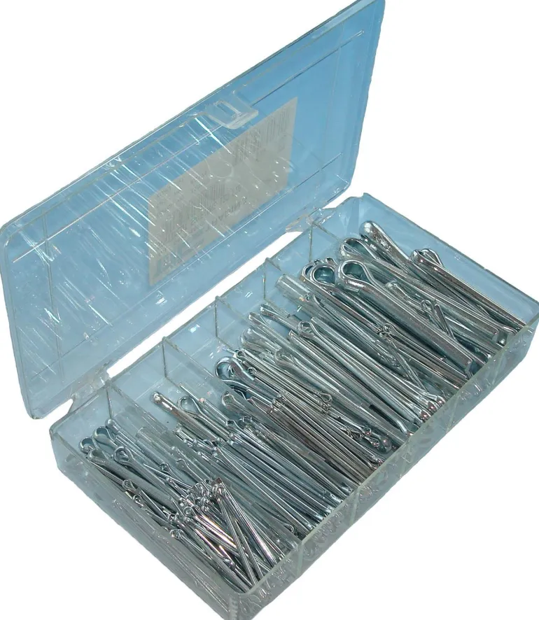 Saksisokat DIN 94 (ISO 1234), sinkitty, lokeroidussa muovikotelossa.