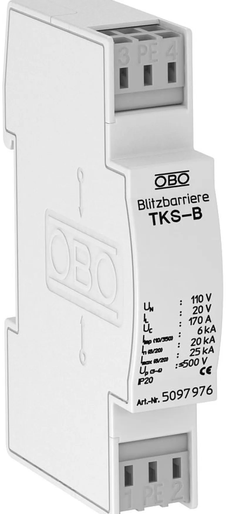 Ylijännitesuoja koostuu kahdesta kaasuylijännitesuojasta. Suoja asennetaan DIN-kiskoon suoraan sisääntulokaapeliin koko rakennuksen kattavissa asennuksissa. Se on 2-napainen ja sen tarkoituksena on suojata analogisia ja digitaalisia televiestintä-, mittaus-, ohjaus-, ohjaus- ja väyläjärjestelmien elektronisia laitteita. Suojaus voidaan myös kytkeä galvaanisesti erottamaan suojattujen kaapeleiden suojaus potentiaalintasausjärjestelmästä. TKS-B sopii hyvin paljon salamoita saaville alueille ja alueille, joilla on avojohtoja. Nimellisvirta IN 16 A.