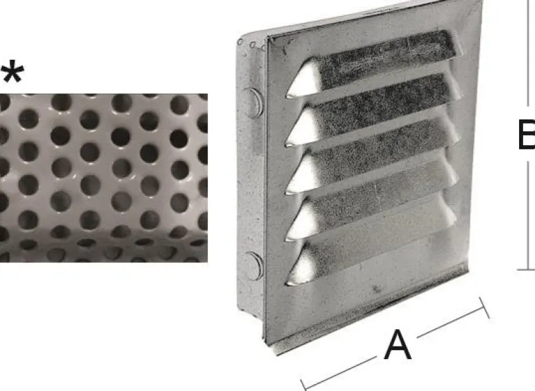Teräksinen säle ja kehys. Taustan reikäpelti, jonka reikien koko on 3 mm, estää hiirien pääsyn sisään.