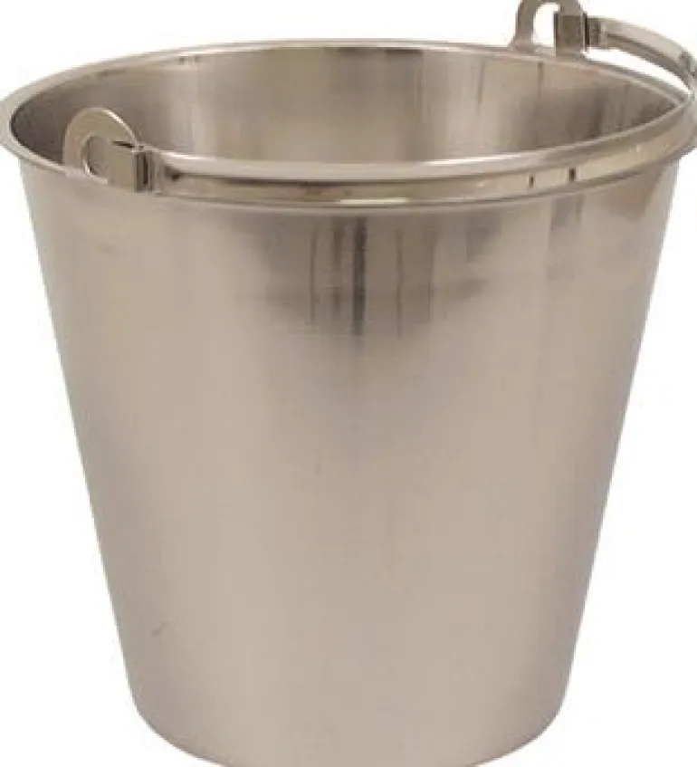 Ruostumattomasta teräksestä valmistettu sanko ilman pohjanauhaa. Litra-asteikko.