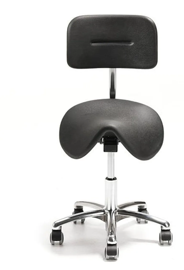 Mukava satulatuoli selkätuella. Istuin ja selkätuki mustaa PU-vaahtomuovia. Istuimen sekä selkänojan kulman ja korkeuden portaaton säätö.