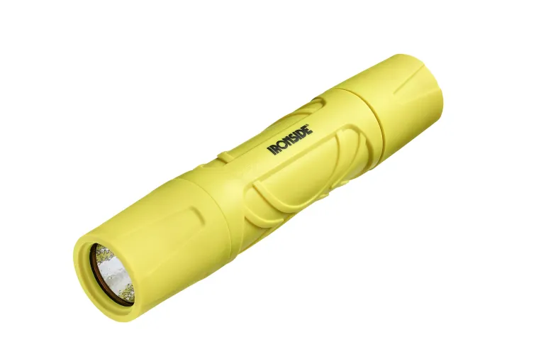 Kätevä, kompakti ja kestävä keltainen LED-polymeerilamppu hyvällä valolla. Toiminnot: Painonappi On/Off.