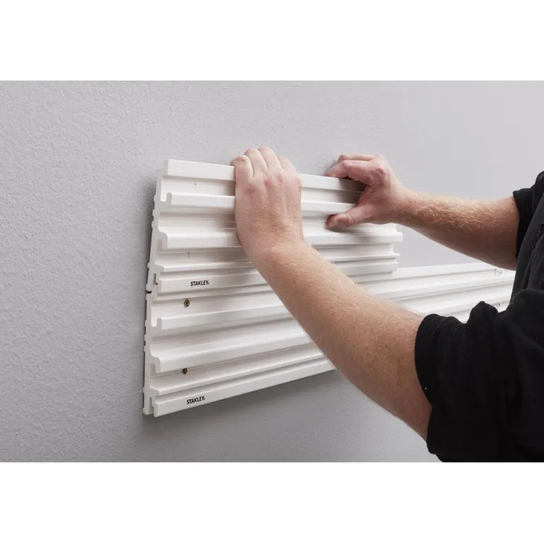 121 cm:n seinäkisko on helppo asentaa poran ja ruuvien avulla kipsiin tai tiiliseinään. Voit asentaa useita kiskoja, jolloin saat koko seinän kattavan ratkaisun, tai rakentaa seinälle pitkänmallisen kiskorivin. Kisko ovat yhdisteltävissä pysty- ja myös vaakasuorassa Track Wall -liitoslevyjen (myydään erikseen) avulla. Kiskot voidaan leikata haluttuun mittaan. Ylä- ja alaosassa olevat urat mahdollistavat esimerkiksi kirjoitustaulun asennuksen halliin tai työpajaan. Seinäkiskot on valmistettu tukevasta ja helposti pestävästä, ruosteenkestävästä ja vääntymättömästä hartsimateriaalista. STANLEY® Track Wall System -peitetulpat (myydään erikseen) antavat seinäkiskoille viimeistellyn ulkoasun. STANLEY® Track Wall System -järjestelmään voidaan liittää monia erilaisia koukkuja ja varusteita kaikenlaisten varusteiden säilytykseen isoista sähkötyökaluista pientarvikkeisiin ja varaosiin. Monet tarvikkeet voidaan kiinnittää vääntö- ja lukitusmekanismilla, joka estää niiden irtoamisen. Yhden seinäkiskon kapasiteetti on 143 kg. Seinäkiskon koko: 121 x 2,5 x 14 cm.