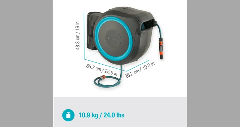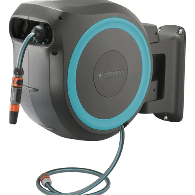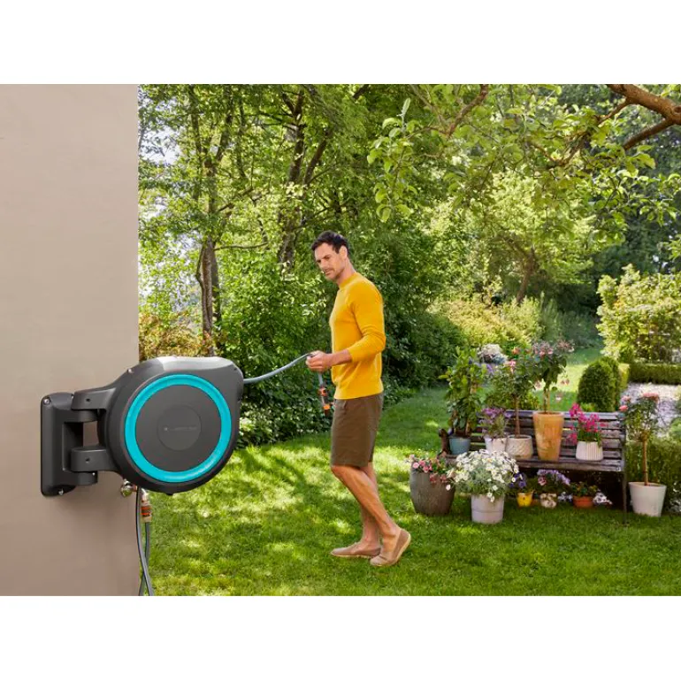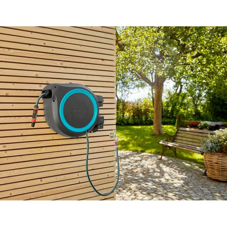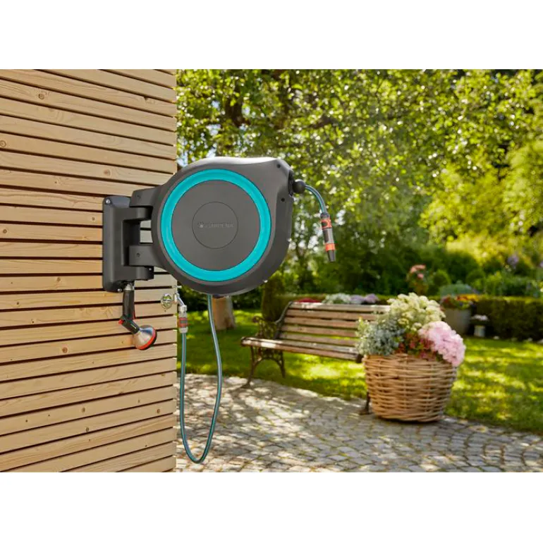 Taloseinään kiinnitettävä letkukela, jonka käytännöllisen seinätelineen ansiosta voidaan kääntää 180°, joten ulotut helposti puutarhan jokaiseen kolkkaan ilman, että letku pääsisi taittumaan. 25 m pituisella laadukkaalla letkulla pääset puutarhan kaikkiin kulmiin. Letku avautuu helposti vetämällä sitä ja lukittuu automaattisesti haluttuun pituuteen erityisen lyhyiden lukituspisteiden ansiosta.
