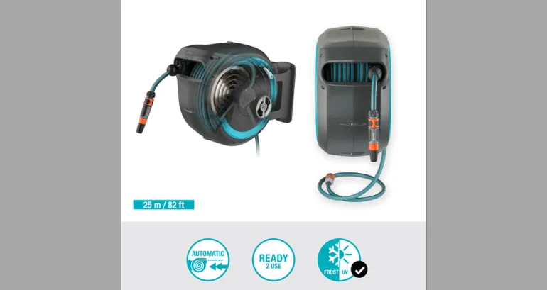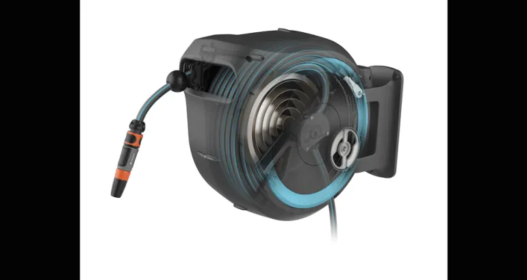 Käytön jälkeen lyhyt nykäisy letkusta vapauttaa lukituksen. Letkukelan sisällä oleva jousi kelaa letkun takaisin automaattisesti, luotettavasti ja tasaisesti. Innovatiivinen RollControl-teknologia varmistaa turvallisen ja hallitun takaisinkelautumisen. Integroidun letkunohjaimen ansiosta letku ohjautuu kelalle tasaisesti ilman taittumista tai menemistä solmuun. Seinätelineessä on tilaa useille kasteluvälineille, jotta ne ovat aina kätevästi lähettyvillä.