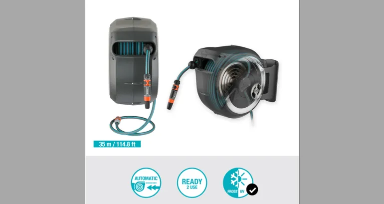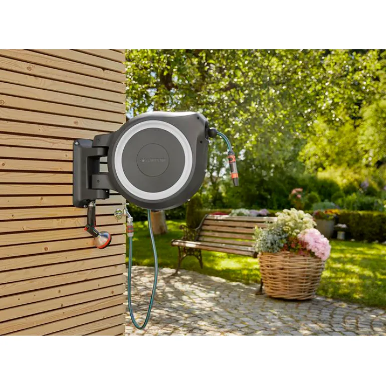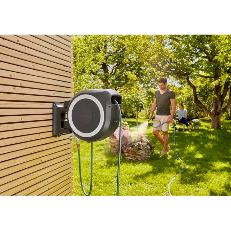 Laatikon liikkuvuuden ansiosta saat erityisen suuren ulottuvuuden ja letkua estetään taittumasta tai kiertymästä. Letku vedetään helposti ulos kastelua varten, ja erityisen lyhyiden lukituspisteiden ansiosta se lukittuu automaattisesti haluttuun pituuteen, kun lopetat vetämisen. Kun työ on tehty riittää, että nykäiset letkusta kevyesti lukituksen vapauttamiseksi, sillä sen integroitu jousi vetää puutarhaletkun automaattisesti luotettavasti ja tasaisesti. Innovatiivisen RollControl-tekniikan ansiosta sisäänveto on erityisen turvallista ja hallittua. Integroitu letkunohjain varmistaa, että letku on kierretty tasaisesti ilman sotkeutumista.