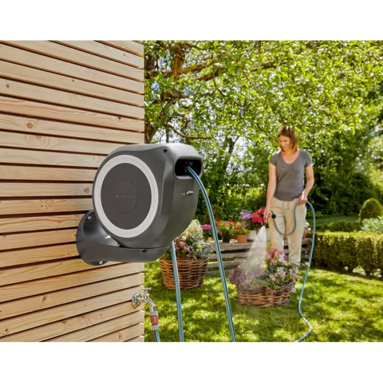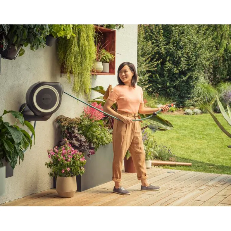Käytä puutarhaletkua vetämällä se yksinkertaisesti ulos ja lyhyiden lukituspisteiden ansiosta se lukittuu automaattisesti paikalleen, kun lopetat vetämisen. Käytön jälkeen lukko vapautetaan kevyellä nykäyksellä letkun päässä. Laadukas letku kelataan sitten automaattisesti sisäänrakennetun teräsjousen ansiosta. Innovatiivinen RollControl-tekniikka takaa letkun turvallisen ja hallitun sisäänvedon.