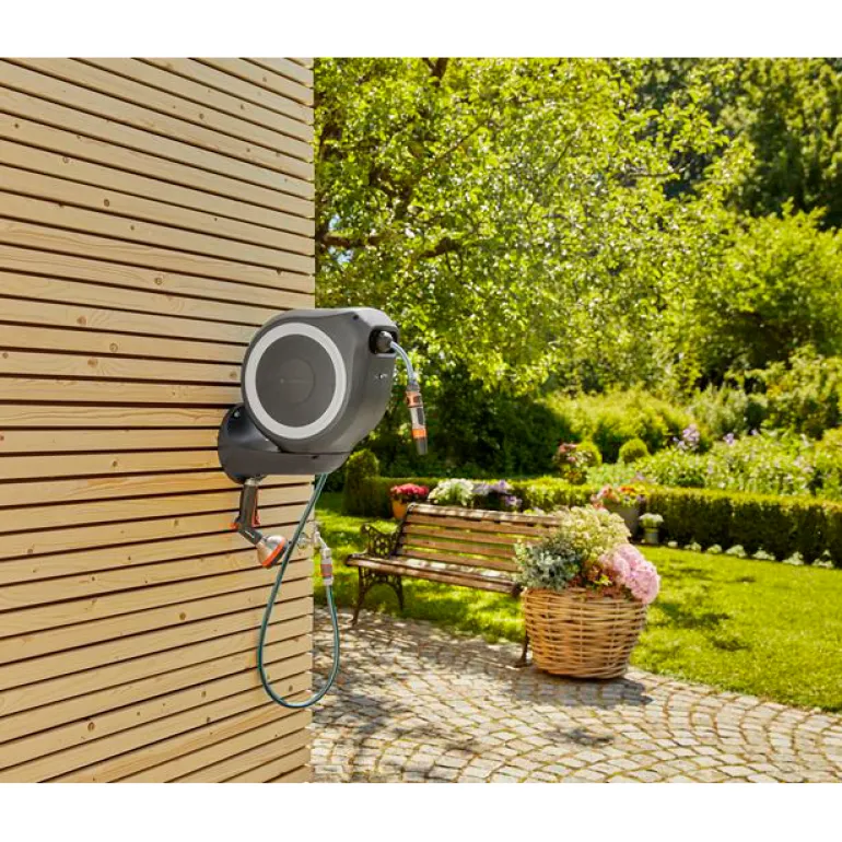 Seinätelineen alla on myös käytännöllinen säilytysvaihtoehto GARDENAn lisäletkutarvikkeille. Kompakti letkulaatikko on valmistettu korkealaatuisista materiaaleista ja siinä on sekä UV- että jäätymissuoja. Tämä tarkoittaa, että laatikko on käyttövalmis ympäri vuoden ja että erilaiset sääolosuhteet eivät vahingoita sitä. Varkaudenestojärjestelmän ansiosta laatikon irrottaminen seinältä ei ole helppoa.