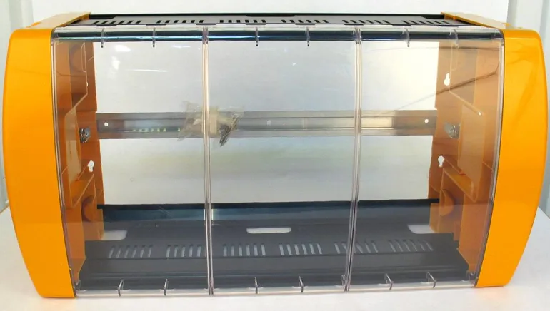 Oranssista muovista valmistettu lukittava seinälle asennettava kaappi, joka suojaa T-05-pääkeskusta lialta, pölyltä ja ilkivallalta. Mukana on kisko moduuleille ja lukko.