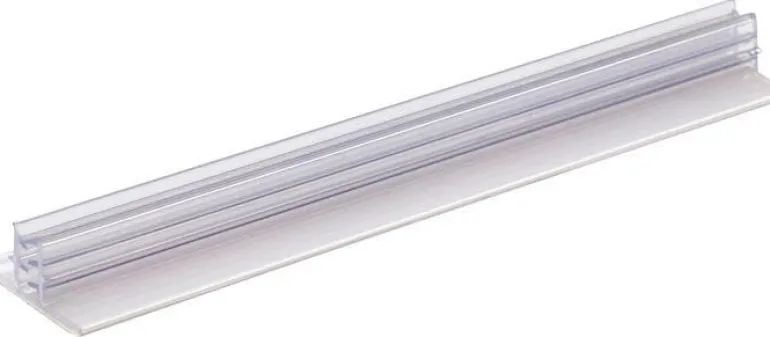 Tarrakiinnitteinen muovinen kylttiteline, voidaan asentaa lippukyltiksi tai riippumaan katosta.