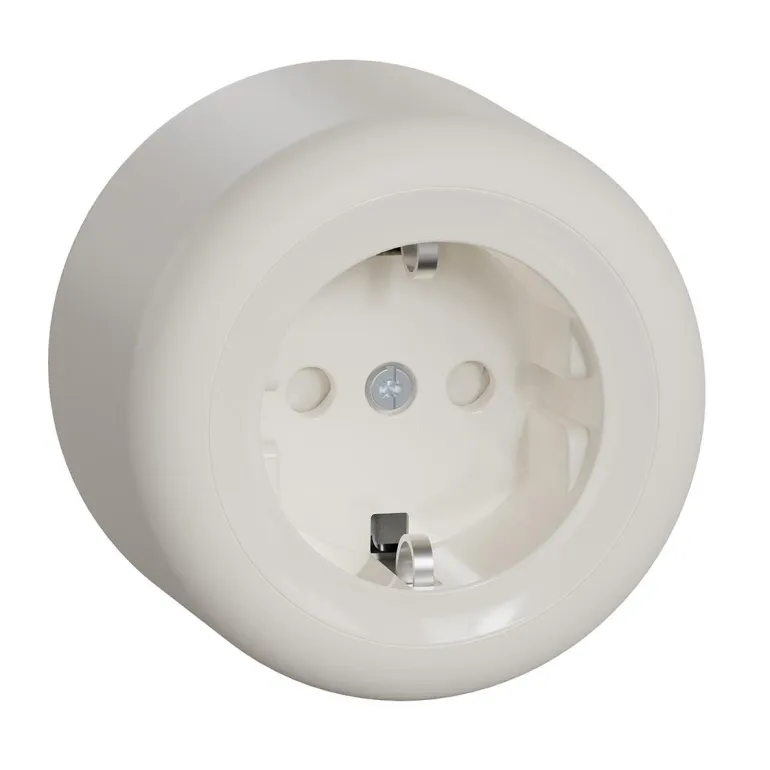 Pistorasia pikaliitännällä pinta-asennukseen integroidulla pohjalevyllä. Pistorasia on maadoitettu ja kosketussuojattu. Tulot kaapeleille takaa pohjalevyn läpi tai kaikilta puolilta käyttäen aukkoja kannessa.