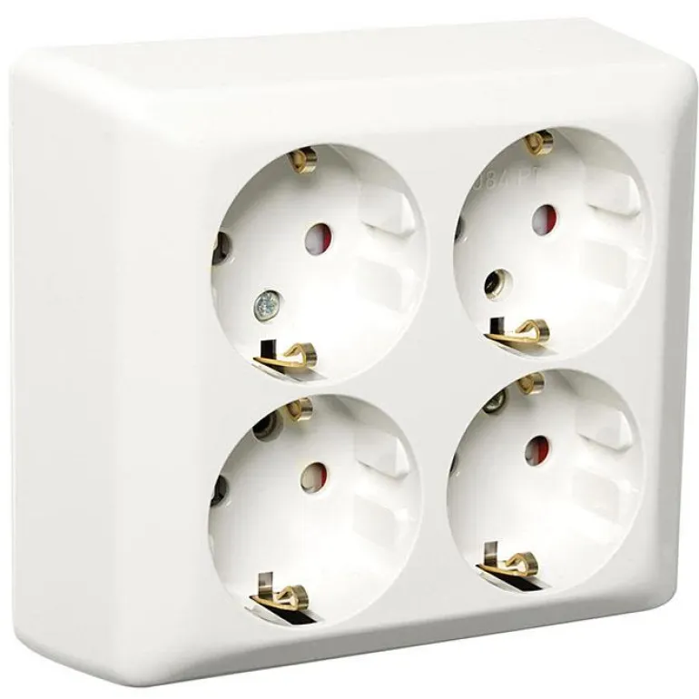 Neliosainen pistorasia, joka on maadoitettu ja sopii pinta-asennukseen. Korkeus 104 mm, leveys 115 mm ja syvyys 43 mm. Pistorasia asennetaan ruuviliittimellä ja siinä on kaksinkertaiset liitännät vaihetta kohti. Asennettavaksi rasiaan tai suoraan seinään, läpivientitoiminnolla.