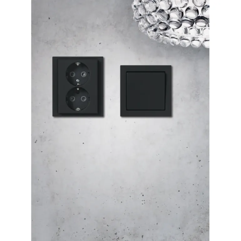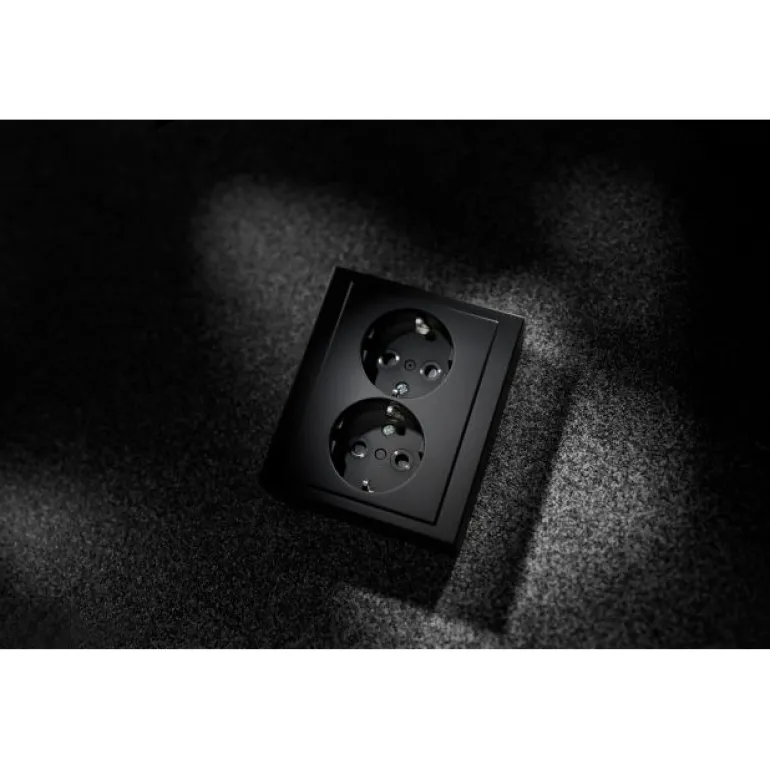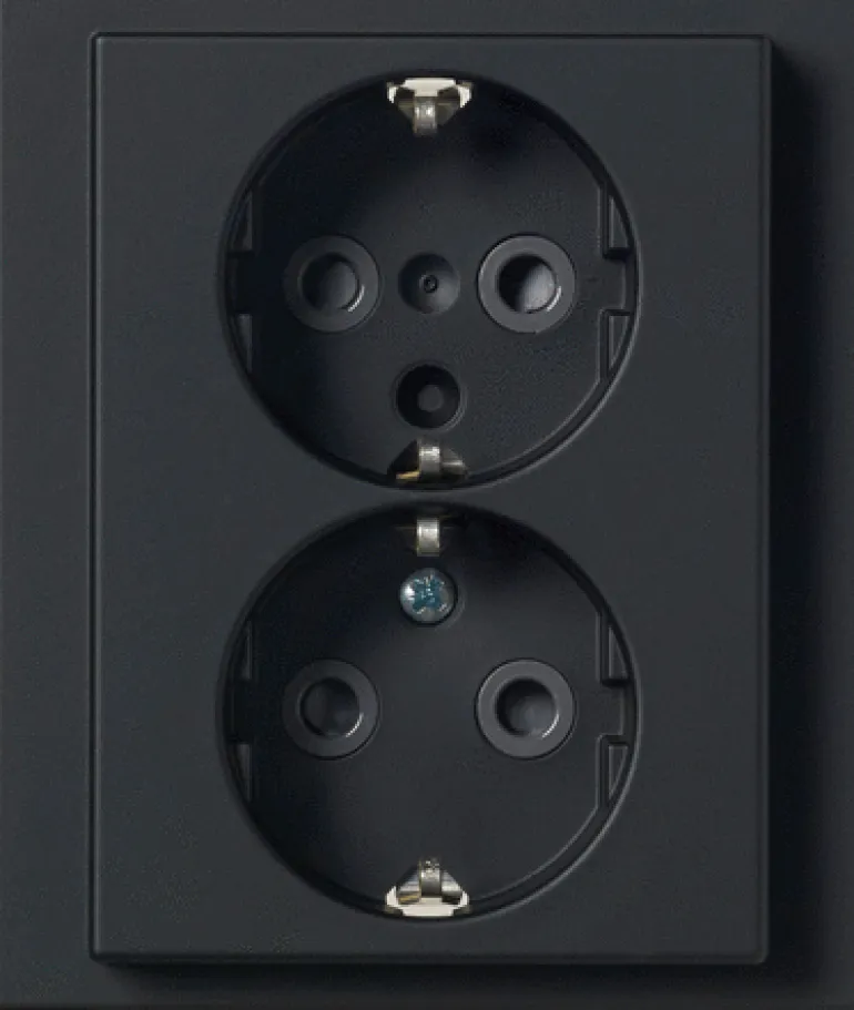 2-osainen, maadoitettu pistorasia, jossa on jousiliittimet. Ei potentiaalivapaita liittimiä, ei kynsiä. Jokaiseen liittimeen voi kytkeä 4 johtoa. Seinäpistorasian suojukset ja maadoitus on integroitu pistorasian runkoon, joten pistorasia on kosketussuojattu ja maadoitettu myös ilman asennettua keskiölevyä ja kehystä. 16 A, 250 V.