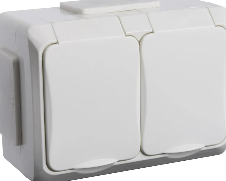 Maadoitettu, koteloitu, 2-osainen seinäpistorasia 16 A/250V itsesulkeutuvalla kannella, IP44 ja hyväksytty ulkokäyttöön.