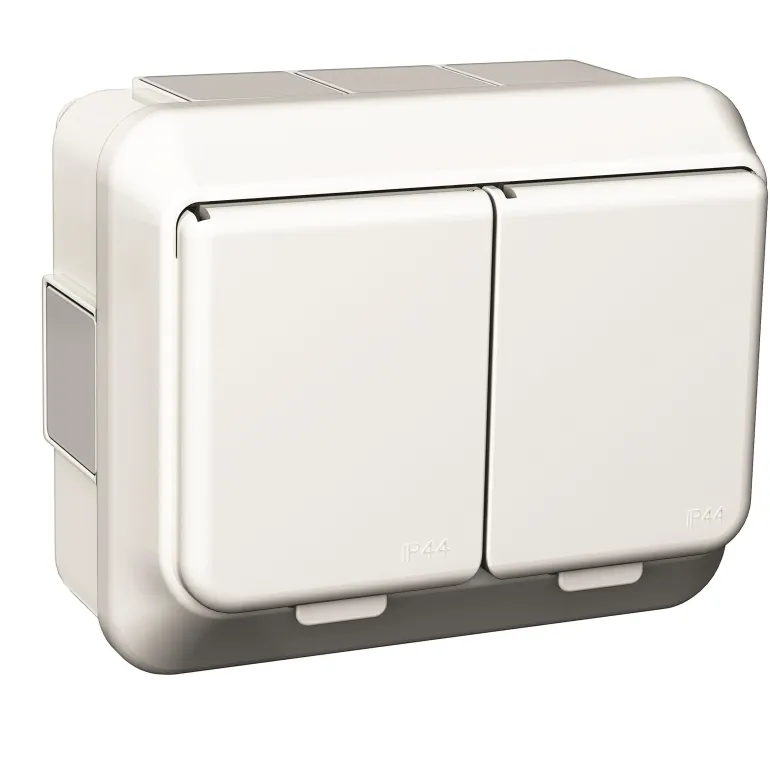 2-osainen pistorasia, pinta-asennettava, läppäkannella, maadoitettu, pistorasioissa on kaksi neutraalia liitospuristinta. Toimitetaan pinta-asennettavan rasian kanssa.