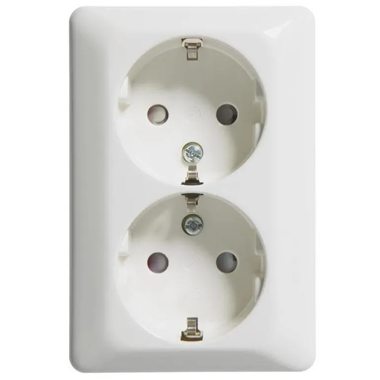 Kiiltäväpintainen pistorasia pinta-asennukseen. Kiinnitetään ruuveilla, mitat 104 x 71 x 41 mm. Pistorasia on maadoitettu ja siinä on halogeenittomasta muovista valmistettu sokkeli ja pohjalevy. Pohjalevyssä on syvennysaihiot 16 mm:n putkille.