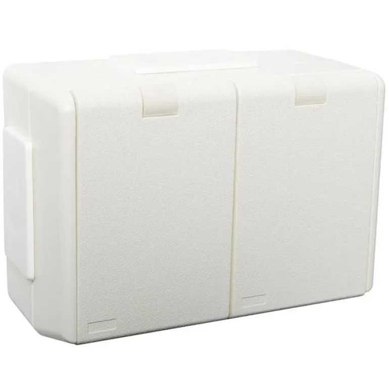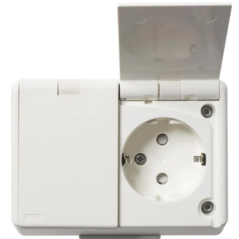 Maadoitettu pistorasia pinta-asennukseen. Erillinen pistorasiapesien syöttö toisen tai molempien pesien ohjaamiseksi erikseen kytkimellä, ajastimella tms. Mallissa on läpivientitoiminto, saranakansi ja kosketussuojaus.