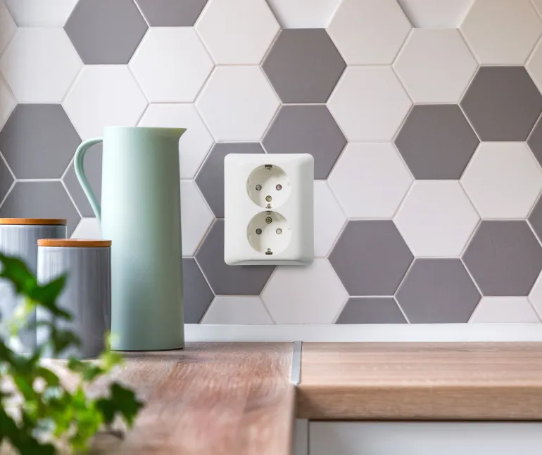 Upotettava 2-osainen Renvit-pistorasia RS-mallia. Maadoitettu ja varustettu kosketussuojatuilla pistorasioiden pesillä.