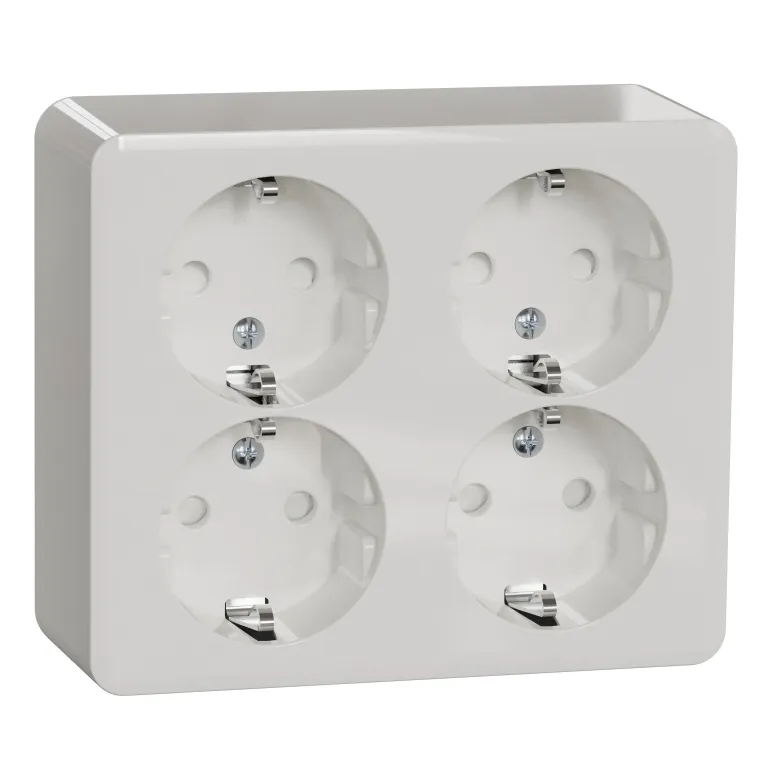 4-osainen seinäpistorasia pinta-asennukseen integroidulla pohjalevyllä. Pistorasia on maadoitettu ja kosketussuojattu.
