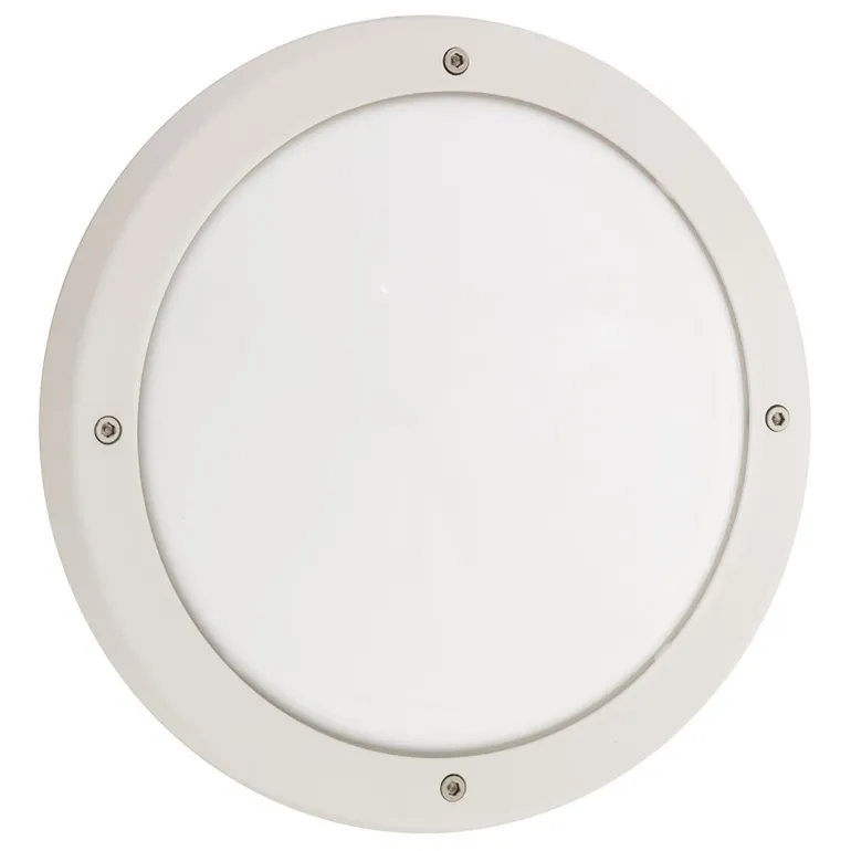 Pyöreä yleisvalaisin, joka voidaan asentaa sekä ulos että sisälle, kattoa tai seinää vasten. Valmistettu jauhemaalatusta valualumiinista.