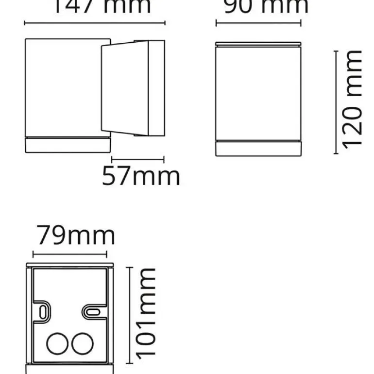 4,5 W:n lieriömäinen seinävalaisin valualumiinista, kirkas lasi, varustettu himmennettävällä GU10-kantaisella LED-valonlähteellä. Värilämpötila 2700 K, valovirta 180 lm ja hajontakulma 35°. Energialuokka A, IP65 ja IK07.