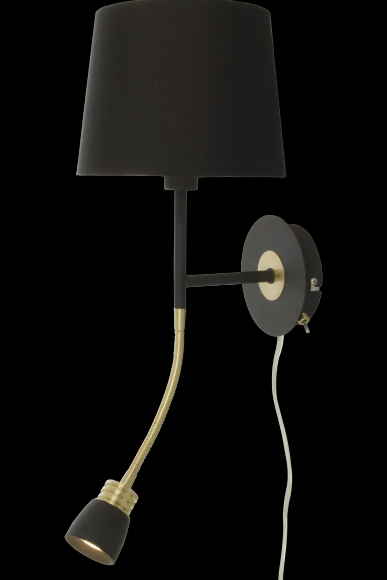 Aneta Lighting Eketorp-seinävalaisin mustaksi lakattua metallia, jossa yksityiskohdat messinkiä (matta) ja musta tekstiilivarjostin. Valaisimessa on säädettävä varsi ja integroitu 3W LED, joka tuottaa miellyttävän lämpimän valkoista valoa.