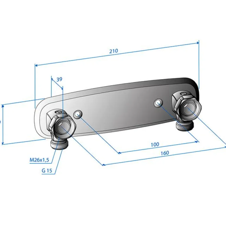 Kromattu sekoittimen kiinnike pintavedetyille putkistoille, M26x1,5-sisäkierre sekoittimeen liittämistä varten ja G15-ulkokierre sisääntuloa varten. Liitäntöjen C/C-etäisyys on 160 mm. Mukana toimitetaan LVI-ruuvi. Ilman liittimiä
