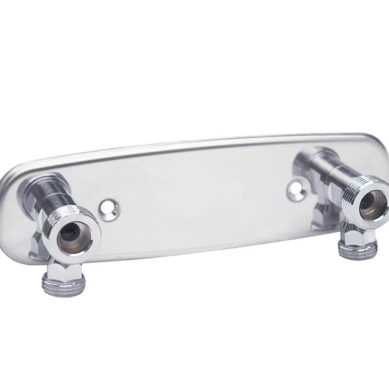 Ruostumattomasta teräksestä valmistettu sekoittimen kiinnike pintavedetyille putkistoille. Sen C/C-etäisyys on 150 mm, ja siinä on kääntyvät liitäntäkulmat ja tasotiiviste puoliliitäntöjä varten.