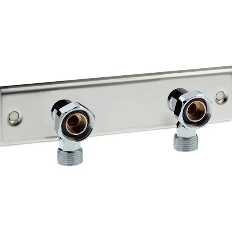 Ruostumattomasta teräksestä valmistettu sekoittimen kiinnike, jossa kääntyvät liitäntäkulmat ja tasotiiviste puoliliitäntöjä varten. Näkyville putkistoille, C/C-etäisyys 100 mm. Mukana LVI-ruuvi asennusta varten. Ilman liittimiä
