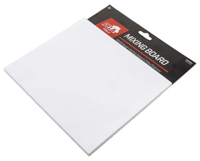 Pela 519773 on 100 arkin nippu tasoitteen sekoittamiseen. Repäise käytetty arkki pois, niin jäljelle jää uusi puhdas sekoituspinta.