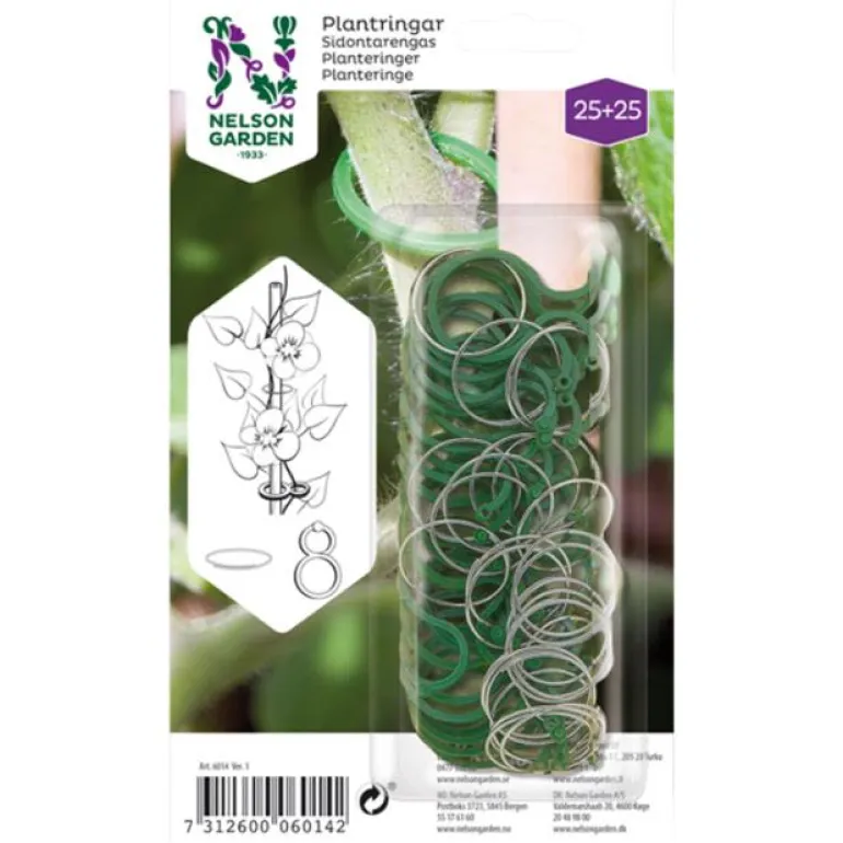 Kaksi erilaista kasvien sidontarengasta, pyöreä metallirengas ja käytännöllinen muovinen 8-rengas. Kasvien sidontaan.