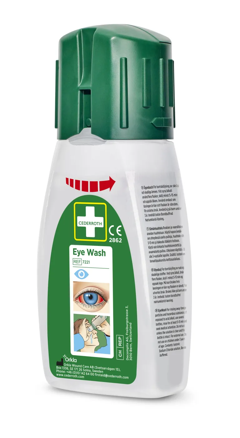 Silmäsuihkupullo 235 ml – mahtuu kätevästi taskuun tai koteloon. Näin huuhtelupullo on aina saatavilla onnettomuustilanteessa. Pieni helppokäyttöinen pullo, muotoiltu huuhtelukuppi ja runsas huuhteluneste. Helppo avata yhdellä kädenliikkeellä Pullo aukeaa helposti kääntämällä.