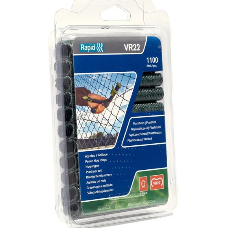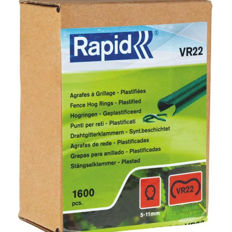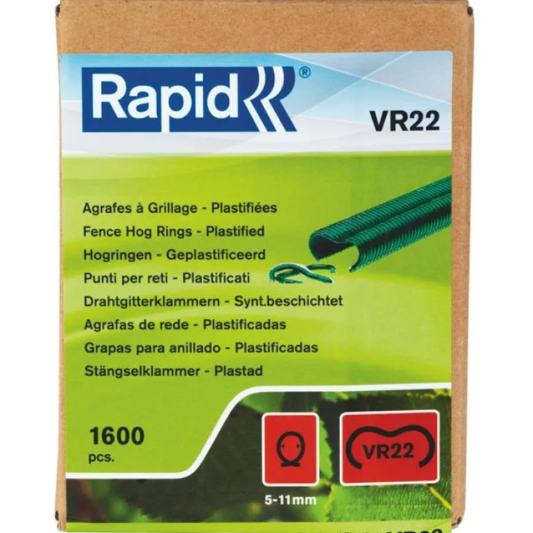 Rapid VR22-sarjan galvanoidut huippulaadukkaat sinkilät vihreällä PET-pinnoitteella verkkojen ja aitojen rakennukseen. Sopii Rapid FP20- ja Rapid FP222 -aitapihdeille. Ihanteelliset sinkilät verkon kiinnittämiseen kompostiin tai häkkeihin. Voidaan käyttää myös verkkokaton ja 5-11 mm paksujen oksien yhdistämiseen. Rapid VR 16 on saatavilla myös galvanoituna tai mustalla muovipinnoitteella.
