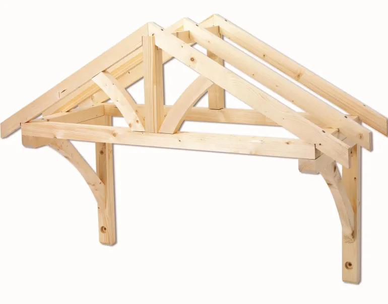 Klassinen kuisti- tai sisäänkäyntikatos käsittelemättömästä kuusesta, perinteisellä harjakattomuotoilulla. Viimeistellään joko kattohuovalla tai peltikatolla.